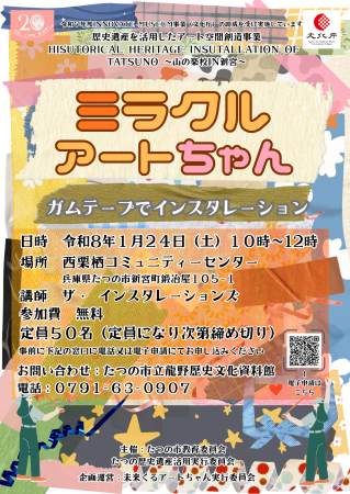 たつの市内にある歴史遺産を活用した参加型のアートイベントを、御津・揖保川・新宮・龍野を巡回しながら開催します。3年目となる本年は、豊かな自然と新宮宮内遺跡や因幡街道など奥深い歴史が伝わる新宮地域が舞台です。