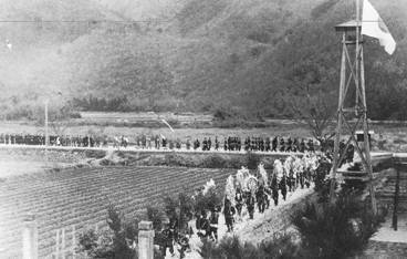 名誉とされた戦死は村葬として迎えられ、おごそかに盛大にとり行われました。写真は東栗栖小学校の村葬会場に到着した行列です。遠方には能地の集落が見えます。学校への入り口と街道の様子は今とあまり変わりありません。